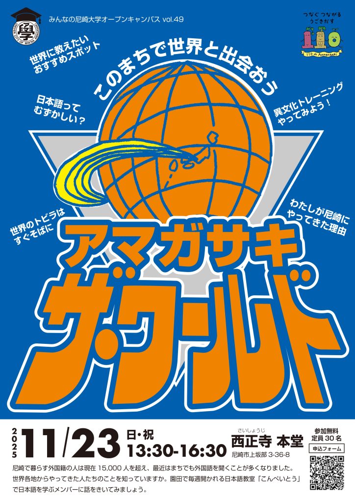 11月23日(日)に、西正寺にて「アマガサキ ザ・ワールド」というイベントが開催されます。尼崎市の取り組みでもある「みんなの尼崎大学」が主催するもので、尼崎市で暮らす外国人の方と交流を深めます。どうぞご参加いただければ幸いです。