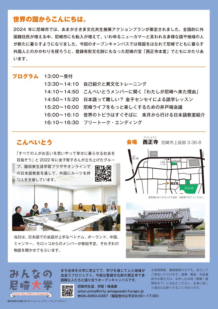 「みんなの尼崎大学」とは、まち全体を大学に見立てて、学びを通じて人と地域が出会うプロジェクトです。今回は、登録文化財の西正寺で多国籍な人たちと語り合うオープンキャンパスです。