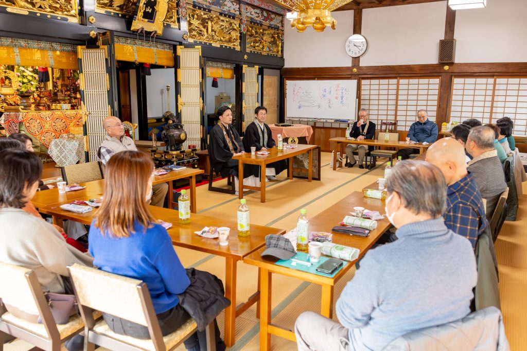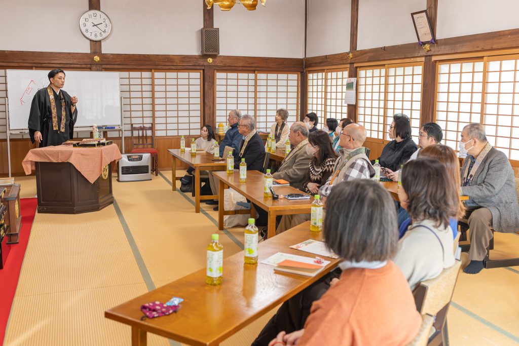 その後は、塚本先生と住職、参加者の皆さんを交えて茶話会を行いました。今回は普段のはすの会に参加されている方や、西正寺門信徒の方、最近お寺周辺の地域に引っ越してこられた方など、様々な方にご参加いただきました。それぞれ、質問や思いを語り合うことで互いに交流を深め、盛会に開催することができました。
